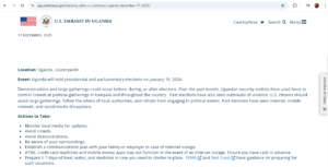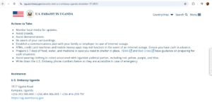 U.S. citizens are encouraged to continue to exercise enhanced precautions and avoid any demonstrations.” Adding: “Actions to Take: Monitor local media for updates. Avoid crowds. Avoid demonstrations. Keep a low profile. Be aware of your surroundings. Carry a charged cell phone and program emergency numbers into your mobile devices. Carry proper identification, including a U.S. passport with a current Ugandan visa.” A matter that was shared out of context.
