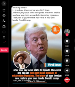 At 14.2K views, the post’s caption reads: “Breaking news!!! I warned you, Museveni, but you didn’t listen. After Iran, my focus shifts to Uganda. Museveni and his son have long been accused of mistreating Ugandans. The future of your freedom now rests in your own hands. Donald Trump.”