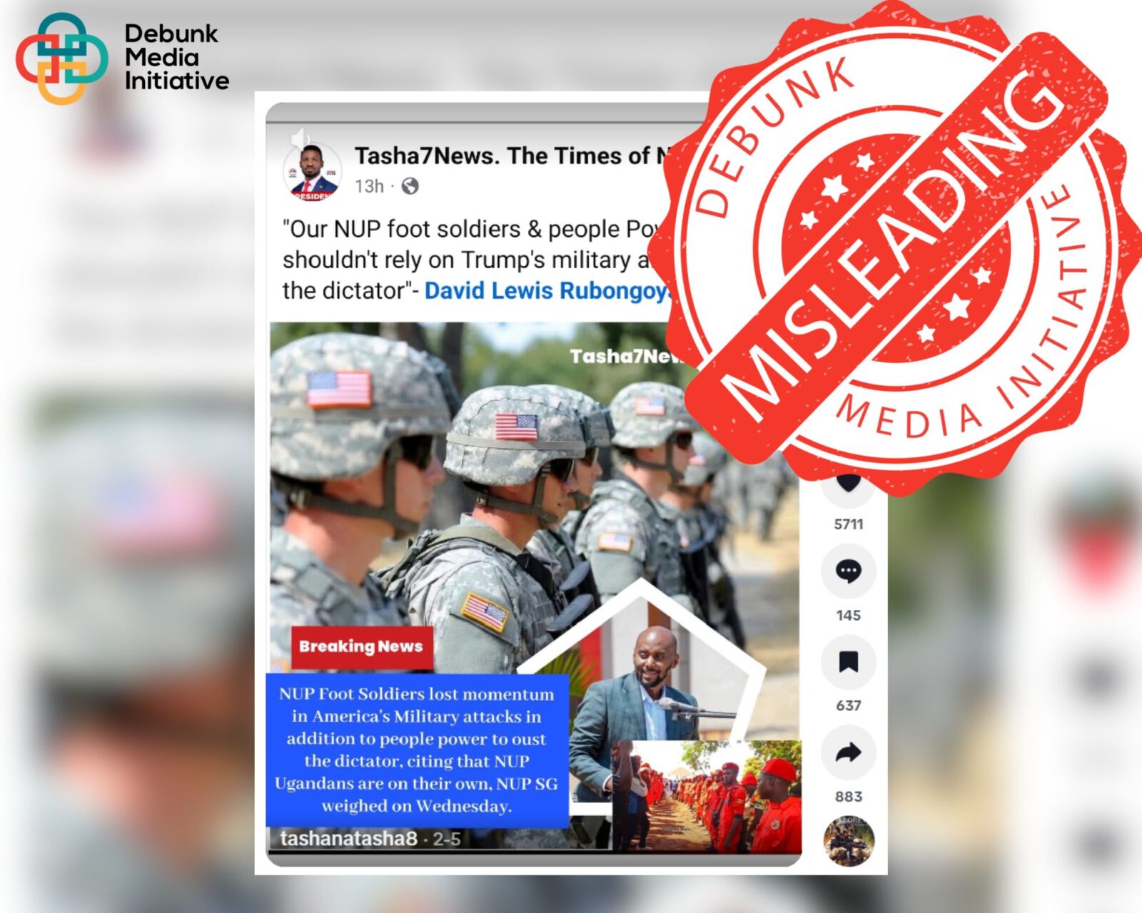 FABRICATED: The claim, ‘Our foot soldiers & people power shouldn’t rely on Trump’s military aide to oust the dictator,’ is false. A review of primary sources, including David Lewis Rubongoya’s verified speech, found no evidence that such a statement was made. The photo circulating in support of the claim misrepresents the individual’s views and lacks authentic documentation, making the claim inaccurate.