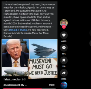 A message circulating on TikTok by Faisal. Media suggesting that U.S. President Donald Trump has organised a team to come to Uganda to arrest President Yoweri Kaguta Museveni and Chief of Defence Forces (CDF) of the Uganda People’s Defence Force (UPDF), Gen. Kainerugaba Muhoozi. This is false.