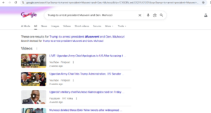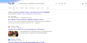 We then did a Google search for coverage of the claim with words like “Trump to arrest president Museveni and Gen. Muhoozi”, which yielded no official statement or credible news source confirming that Trump is preparing a mission or legal action to arrest either President Museveni or Gen. Muhoozi.