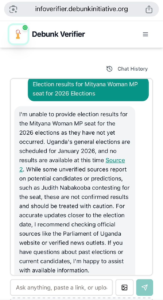 Using the InfoVerifier, an online fact-checking platform, it shows that the election results for the Mityana Woman Member of Parliament seat in the 2026 election have not yet occurred. The 2026 Uganda general election is scheduled for January 2026, and no results are available at this time.