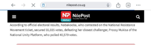 Whereas a verified source, NilePost, indeed confirms Hon. Nabakooba as the MP-elect for the 2026 elections under the National Resistance Movement; she secured 55,035 votes, defeating her closest challenger, Mukisa Proscovia, also known as Nabbosa of the National Unity Platform, who polled 40,579 votes, and Baagala finished third with 10,179 votes. Catherine Nalweyiso Tusuubira trailed with 710 votes.