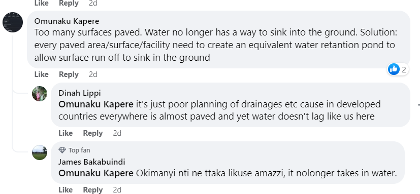 A screenshot of a Facebook comment shared with us claims that paved surfaces prevent water from sinking into the ground, causing flooding. This was on a Facebook post about a downpour in Namboole, Uganda, where water covered the road.