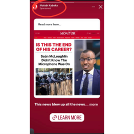 We checked one of the sponsored clickbait articles on Instagram from the account of “Mutebi Kabaka” to see the target audience of the individual. The target shows the ads are centered to Uganda as a location and the age is set to people ages 25 years and above.