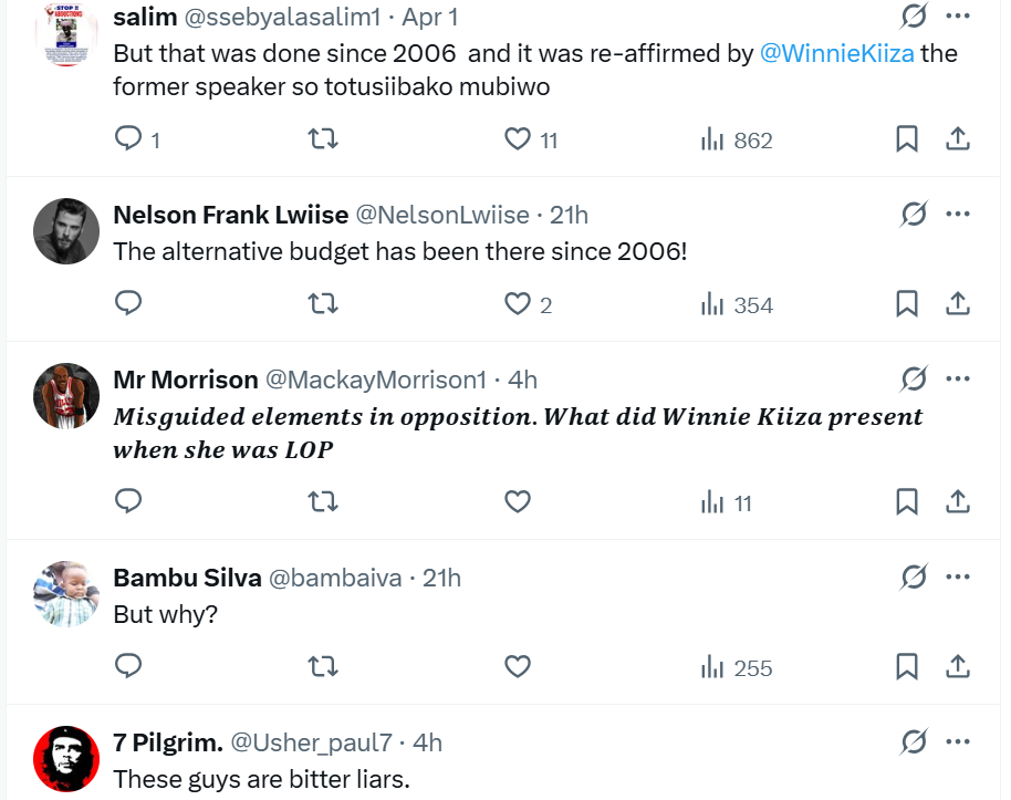A tweet from former Leader Of Opposition, Hon Winnie Kizza dispelled this statement as false and stated that alternative budgets have existed since Rt. Hon. Prof. Ogenga Latigo’s tenure in 2006.