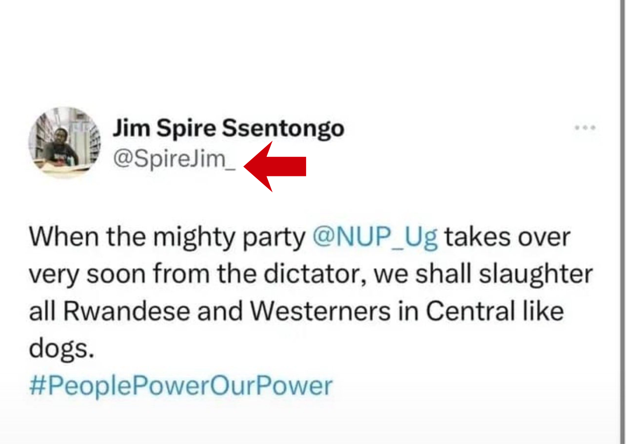 A post by a user Ngabirano Grace on X, formerly known as twitter shared an alleged post from Jim Spire Ssentongo stating that when National Unity Platform takes over from the dictator, they shall slaughter all Banyarwanda and Westerners in Central like dogs.
