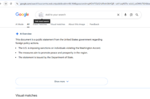 Another search on the picture on the right of the video did not pick much details as it was too blurred. The results confirmed that the document was a public statement from the U.S government on foreign policy.