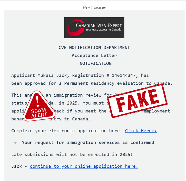 An email sent from “usafis@usafisnews.org” claims the recipient, Mukasa Jack, has been approved for a permanent residency evaluation to Canada.He is then directed to complete registration through a company called Canadian Visa Expert. The message includes a deadline, suggesting urgency, and links to a page hosted at ip.canadianvisaexpert.com.