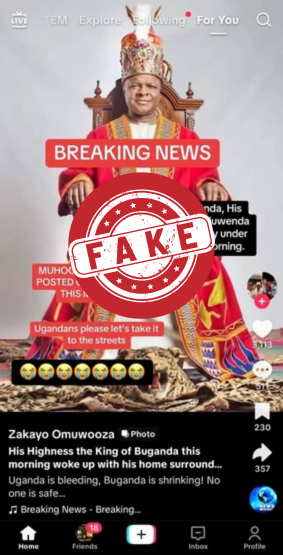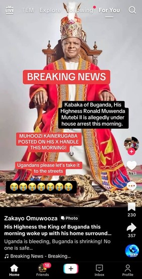 A screenshot from TikTok was shared on WhatsApp alleging that the Kabaka (King) of the Buganda kingdom, His Highness Ronald Muwenda Mutebi II, is under house arrest. This claim is false. The motive is clear: to incite violence and mislead the Baganda to riot, as history has seen.