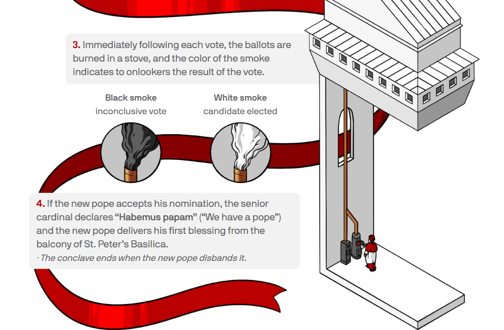 Voting is conducted through secret ballots. Each cardinal writes the name of their chosen candidate on a ballot and places it into a chalice on the altar. To be elected, a candidate must receive a two-thirds majority. Up to four ballots can be cast each day—two in the morning and two in the afternoon. After each voting session, the ballots are burned: black smoke indicates no decision, while white smoke signals that a new pope has been elected.