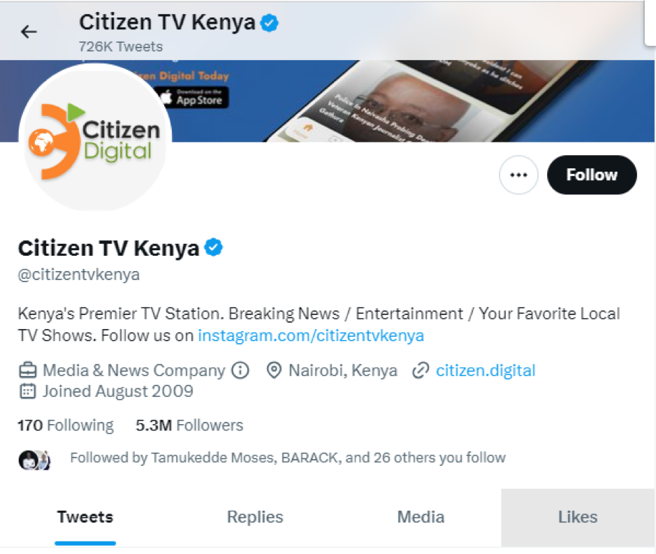 The Official Account of Citizen Tv is @CitizenTvKenya with a following of 5.3M and has got a BlueTick to differentiate it from all other accounts.
