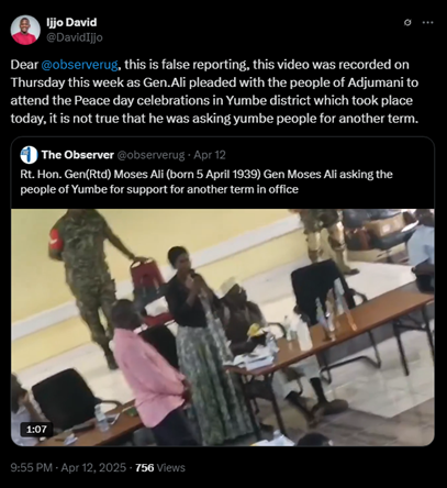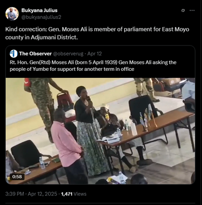 A video of Gen Moses Ali has been posted on The Observer Newspaper X claiming that “Rt. Hon. Gen(Rtd) Moses Ali (born 5 April 1939) Gen Moses Ali asking the people of Yumbe for support for another term in office”. This video got over 400 thousand views and was shared by more than 900 people. This video was also shared on Facebook furthermore sharing this misleading information.