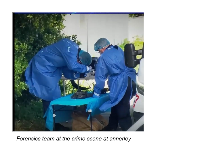 The forensic crime scene images shown are also from elsewhere, specifically the Annerley shooting in Brisbane, Australia, on January 10, 2025, where a Queensland police officer and a man were shot during an altercation.
