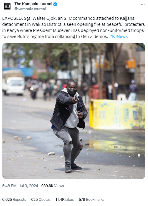 The tweet from The Kampala Journal X account claimed that Uganda’s President who also acts as chief commander of the Ugandan security forces had authorised the deployment of the Special Forces Command into Kenya to save President Ruto’s regime. And that a member of the SFC, Sgt Walter Ojok is pictured shooting at unarmed protesters.