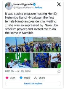 “It was such a pleasure hosting Hon Dr Netumbo Nandi -Ndaitwah the first female Namibian president in waiting ….she was so impressed by Nakivubo stadium project and invited me to do the same in Namibia,” he tweeted.