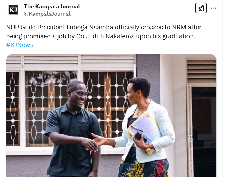 The Kampala Journal News’ (KJNews) X post claiming that current Makerere Guild President Lubega Nsamba met with the Head of the State House Investors’ Protection Unit (SHIPU), Col. Edith Nakalema, to cross from his party, National Unity Party (NUP) to the ruling party National Resistance Movement (NRM) after being promised an employment chance after graduation is incorrect. Their photo has been used out of context.
