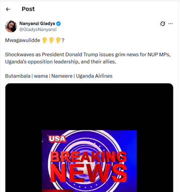 It is within this contested information environment that a viral video began circulating online claiming that U.S. President Donald Trump delivered a message declaring Uganda peaceful and beyond the need for foreign political intervention, framing this as grim news for NUP Members of Parliament and opposition leadership. Because such a message, if genuine, would carry political weight and symbolic implications for how competing narratives about Uganda are perceived, the clip quickly gained traction and emotional reaction.