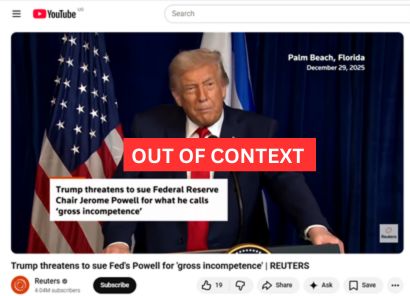 A source trace of the viral clip shows that the underlying footage does not originate from a Uganda-related address or an international political briefing. Reverse image searches of key frames matched the visuals to a verified Reuters news video titled “Trump threatens to sue Fed’s Powell for ‘gross incompetence.” The original broadcast includes on-screen identifiers showing Palm Beach, Florida, December 29, 2025, and a Reuters lower-third caption stating that the remarks concern possible legal action against Federal Reserve Chair Jerome Powell.