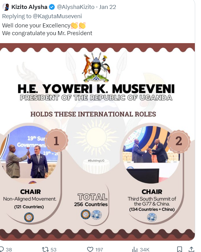 This infographic shared by Alysha Kizito on social media platform X also known as Twitter, has information claiming that Ugandan President Yoweri Kaguta Museveni holds two international positions. One is being the Chairperson of the Non-Aligned Movement consisting of 121 countries and the other is being the Chairperson of the Third South Summit or G77 consisting of 134 countries and China.