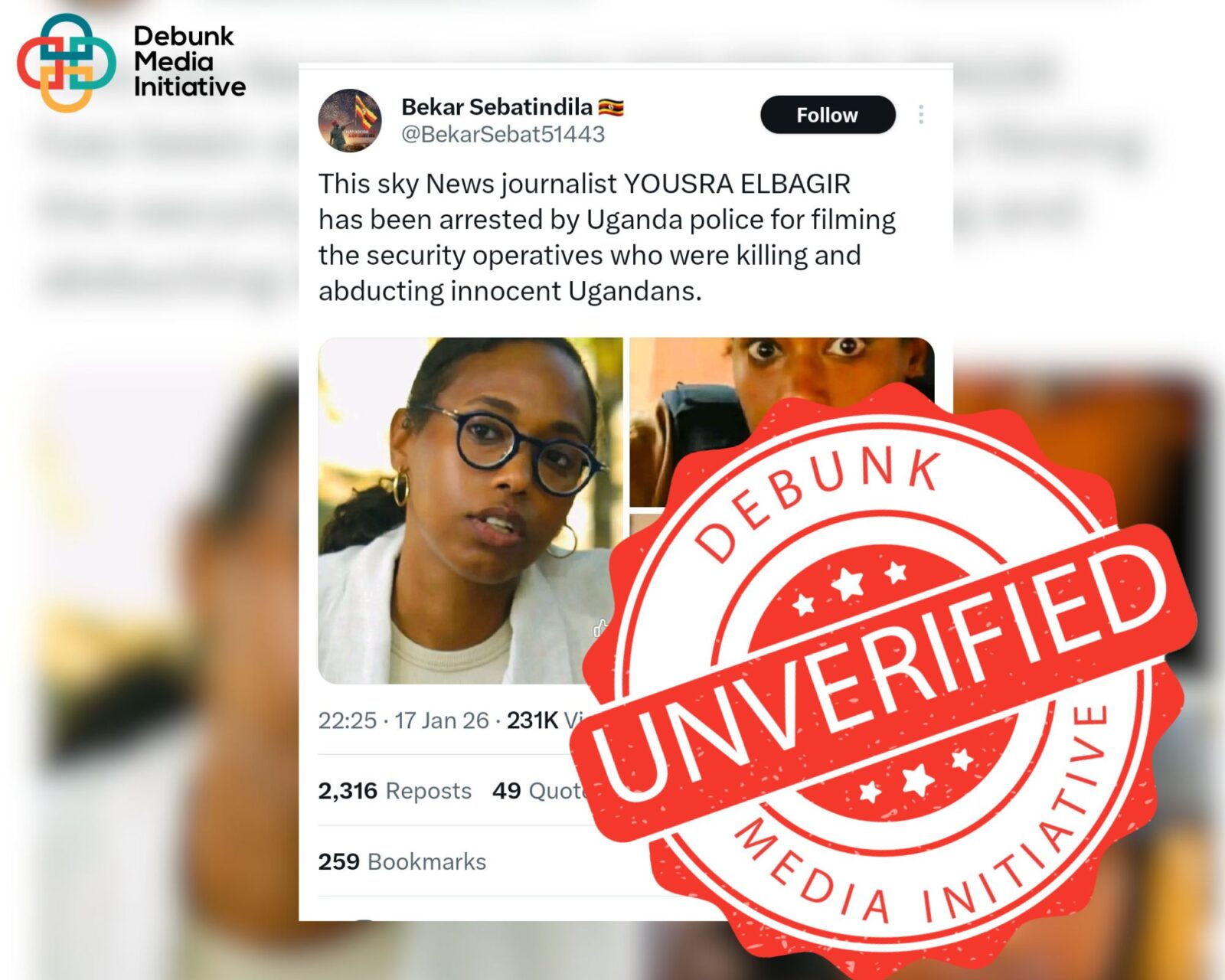 The post, shared on January 17, 2026, at 11:25 AM, read: “This Sky News journalist, YOUSRA ELBAGIR, has been arrested by Ugandan police for filming the security operatives who were killing and abducting innocent Ugandans.”