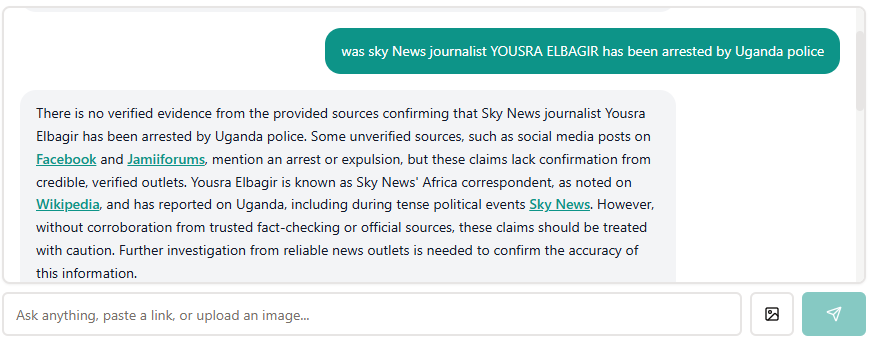 When we ran this claim as a prompt in the Info Verifier, the results showed that there is no verified evidence confirming that Elbagir was arrested by Ugandan police.